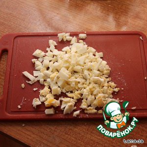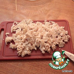 Отвариваем куриное филе, остужаем и мелко нарезаем. Отправляем в емкость, в которой будете перемешивать (советую взять кастрюлю :))