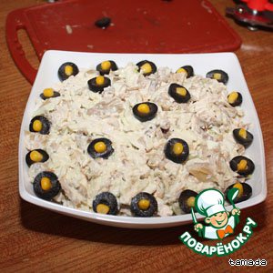 Ну и все. Заправляем майонезом, выкладываем в салатницу и украшаем по желанию. Если работаете в Билайне, такое украшение, будет как раз то, что надо! Приятного аппетита