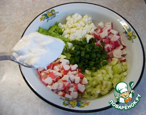 • Я заправила сегодня сметаной. Но заправка здесь берется на ваше усмотрение: подходит практически все! И вкус всегда замечательный! Я пробовала: лимон+оливковое масло, майонез, просто сок лимона, даже кефир (индивидуально для себя).