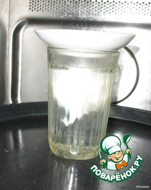 Совет: также можно накрывать стакан обычной пищевой пленкой (с не ничего особенного не происходит в микроволновке, слегка поднимается), но зато не образовываются испарения, т.е. не стекает вода.