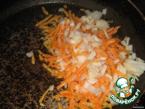 Далее делаем зажарку. Лук нарезать, морковь натереть на тёрке. Если есть сало, то режем его на маленькие кусочки. -