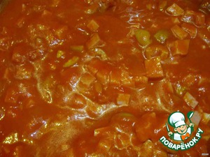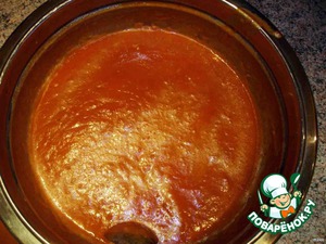 Из томатного соуса выкидываем лаврушку, соус измельчаем в пюрешку.