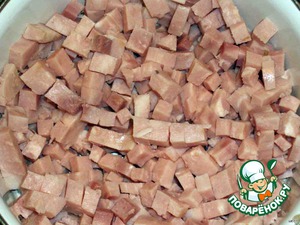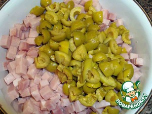Смешиваем соус с ветчиной и оливками, добавляем уксус и соль по вкусу.