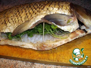 Я не правильно сделала, что запекла одного большого карпика!!! Во-первых - обжарить его невозможно, а во-вторых - резать этого слоника на порции было тоже очень неудобно. Поэтому лучше брать 2 средних карпа - или вообще 4 маленьких!!!