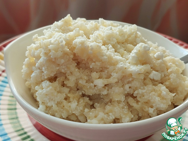 В практически готовое пшено вмешиваем творожно-сахарную смесь. Каша на глазах становится воздушной, как будто взбитой. Накрываем крышкой и оставляем на слабом огне еще на пару минут.