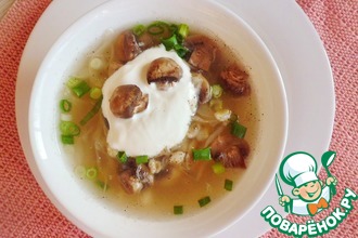 Сварить бульон по вкусу. Блинчики нарезать на тонкие полоски и разложить по тарелкам залить горячим бульоном и посыпать петрушкой или шнитт луком или мелко нарезанным зелeным. Тут же подавать к столу. Готовые нарезанные блинчики можно заморозить и хранить 6 мес. в морозилке. В этом случае заливают бульоном или бросают в него и прокипятить 1 минуту. Просто и вкусно.