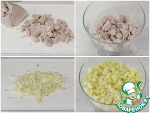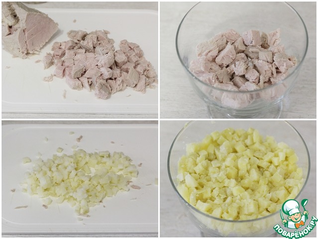 Отварное мясо и картофель нарезать на мелкие кубики.
