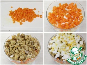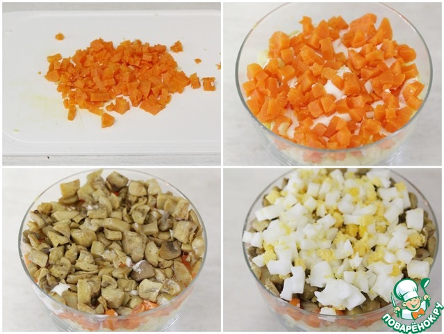 Отварную морковь нарезать на мелкие кубики, выложить поверх картофеля и промазать майонезом.