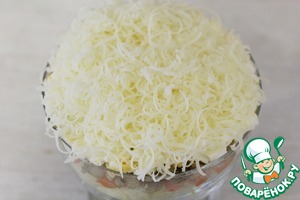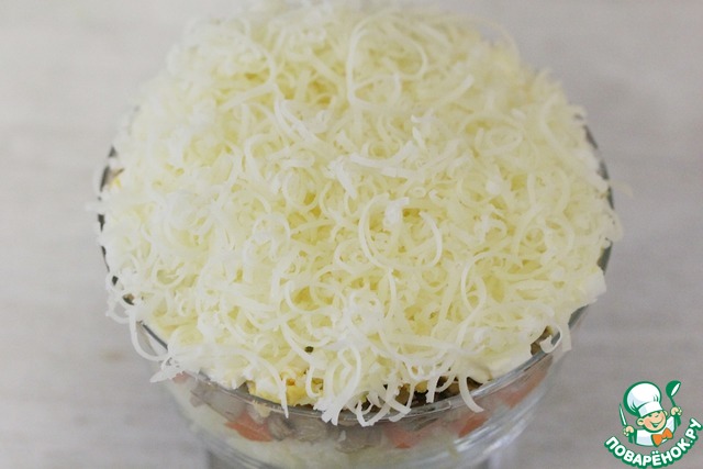 Сыр натереть на мелкой тёрке и посыпать им салат.
