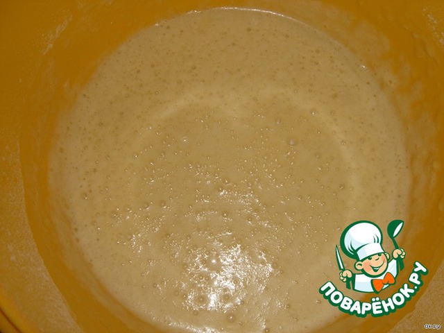 Из яиц, пива, муки, растопленного масла, соли, соды и сахара замесить тесто для блинов. Оно получается не очень жидкое, средней густоты.