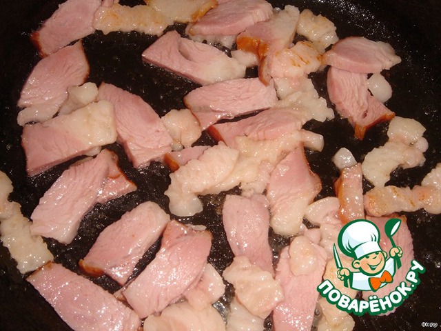 Бекон порезать полосками и обжарить на сухой сковороде, жира от бекона достаточно. -