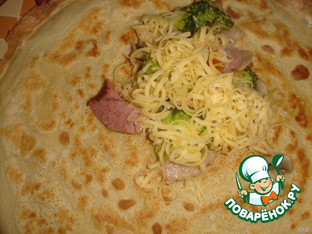 На блинчик положить немного начинки, присыпать тертым сыром, свернуть.