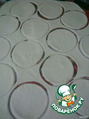 • Готовое тесто раскатать и стаканом вырезать кружочки.