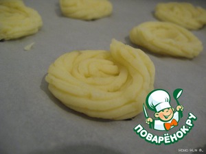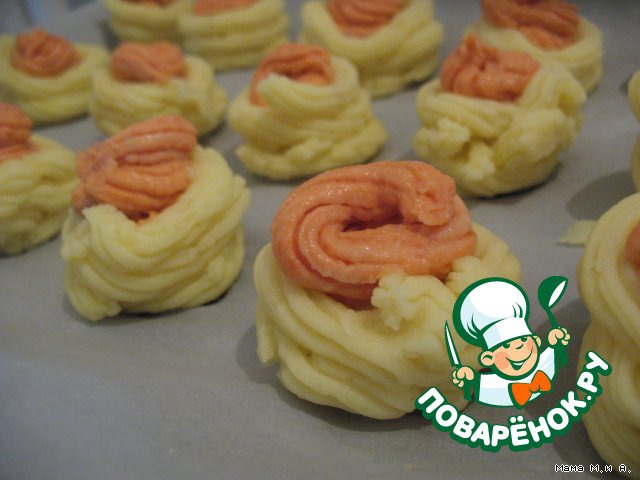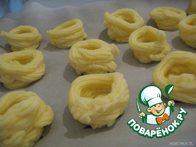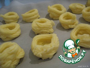Противень (или большую низкую форму) выложить пекарской бумагой. На бумаге с небольшими промежутками с помощью кондитерского шприца выложить 16 кружков диаметром 5-6 см - это донышки корзинок.