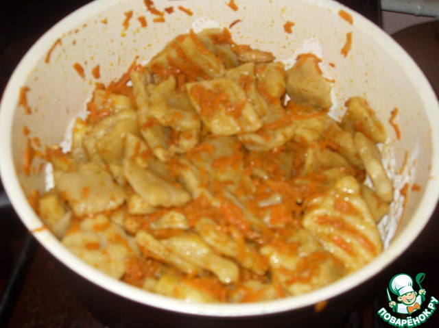Добавить натертую морковь, посолить, поперчить, приправить любимой куриной приправкой. Когда морковь тоже слегка зарумянится, залить все водой, чтобы она покрыла мясо.
