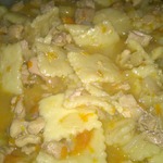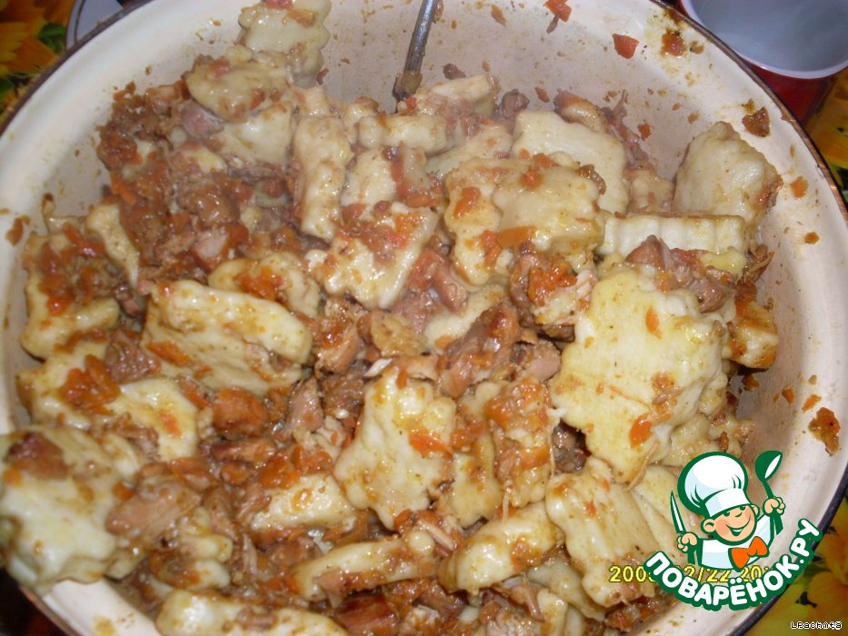 соединяем куриную заливку и готовые товченыки, добавляем измельченный чеснок и хорошенько все перемешиваем.