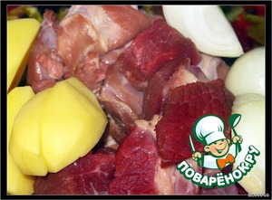Подготовим продукты для фарша.Мясо нарезать небольшими кусочками, картофель и лук очистить, нарезать на четвертинки.Хлеб замочить в молоке.