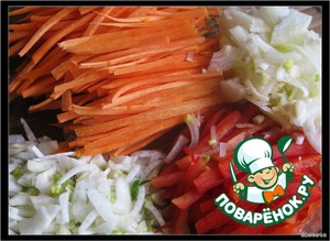 У фенхеля отрезать стебель и зелень и мелко нарезать,репчатый лук нарезать четвертинками колец, морковь и перец - соломкой. -