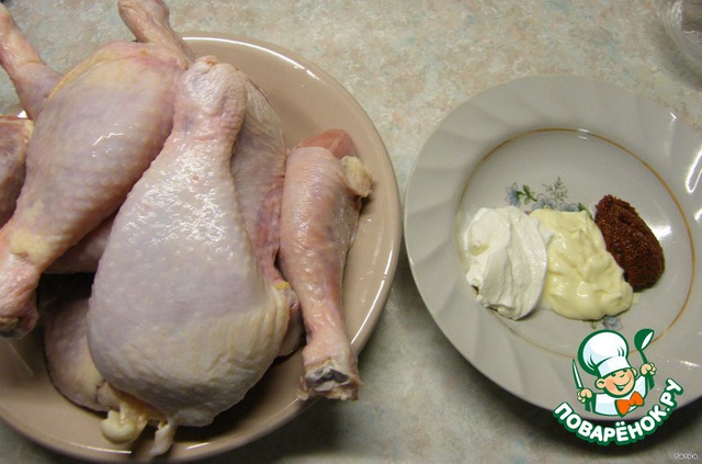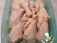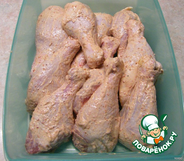 Голень натираем соусом и маринуем в течение 3-х часов при комнатной температуре, я ставила в холодильник на ночь. |
