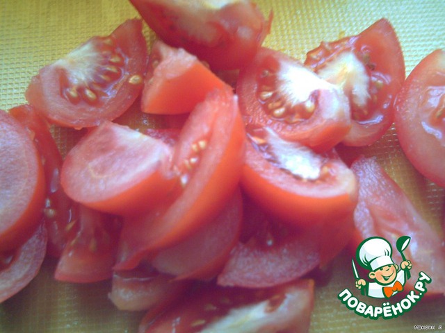 Помидоры нарезаем пополам, а потом половинки еще на четыре части.