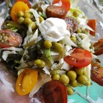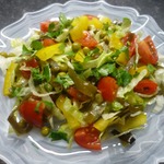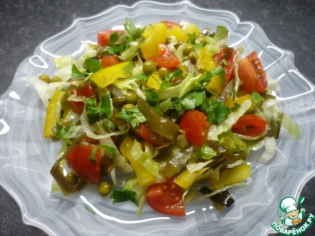 Для приготовления салата нам понадобятся: пекинская капуста, четверть кочанчика, морская капуста (200 г), перец 1 шт, помидоры маленькие 3 шт, ½ банки горошка. Заправляем маслом.