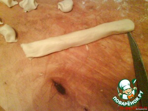 Готовим тесто. Размешаем в воде с кефиром яйцо, добавим 1/4 ст. л. соли и муку. Замесим тесто как на пельмени. Присыплем доску мукой, положим тесто, накрыв его широкой нагретой на огне кастрюлей. Через полчаса скатаем жгут, разрежем на кусочки.