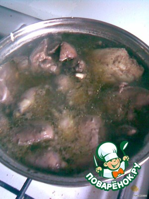 Куриную печень (у меня было печень+сердце) отварить в подсоленой воде до готовности