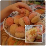 второй - то же самое, только вертикально, чтобы был, например, красный низ, желтый верх, а другой бочок наоборот... так они получаются естественней... каждый персик после окрски окунаем в сахар.