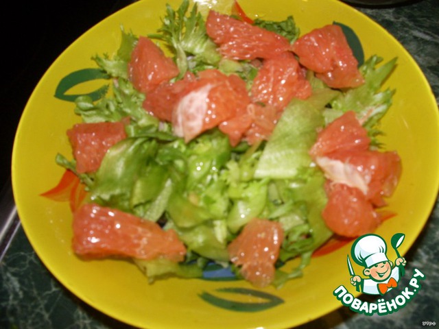 Итак, салатик рвем на кусочки, грейпфрут отчищаем от белой пленки, делим на крупные кусочки.