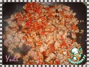 Фарш (у меня свино-говяжий) обжарьте на масле, введите томатную пасту.