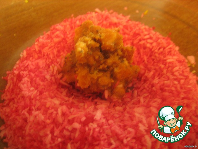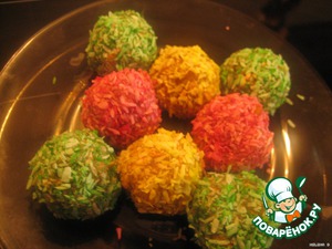 перемешиваем,формируем шарики и обваливаем их в разноцветных кокосовых стружках