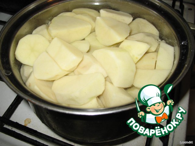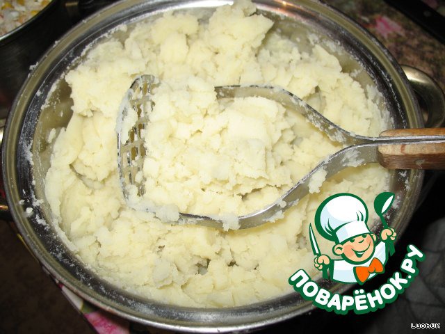 Когда картофель сварен, сливаем воду и делаем пюре. Чтобы пюре не было слишком плотным разбавляем его молоком или водой, в которой варился картофель.