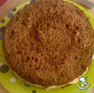 Начинаем собирать торт. Корж с какао разрезаем на два, если он получился выпуклый, то верхушку срезаем и оставляем.