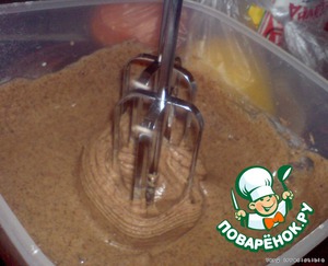 Займемся шоколадным бисквитом. Взбиваем одно яйцо и полстакана сахара, добавляем полстакана сметаны, половину чайной ложки гашеной соды. Добавляем просеянную муку и какао порошок, хорошо перемешиваем миксером.