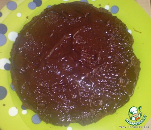 Кладем на блюдо первый корж, хорошо пропитываем вермутом и смазываем шоколадной помадкой. -