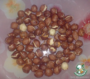 Пока печется шоколадный бисквит займемся орехами. Если у Вас неочищенный сырой фундук, как у меня, то его необходимо подсушить. Это можно сделать на сковороде, в духовке или в микроволновке, как сделала я - поставьте на 1,5-2 минуты на максимальную мощность.