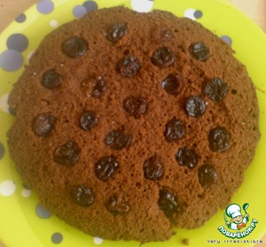 Сверху кладем второй такой же корж, пропитываем вермутом и как бы втыкаем в него вымоченный изюм. Снова смазываем помадкой.