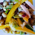 2. Остальные ингридиенты порезать полосками и смешать , добавить горошек и маринованный лук, запрвить маслом!