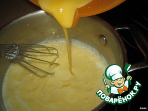 Взбитый с желтками крахмал вылить при энергичном размешивании в кипящее молоко, дать ему несколько раз подняться. -