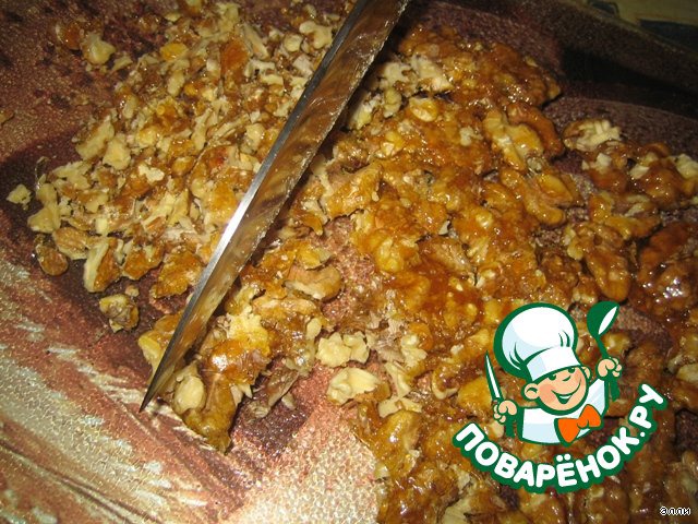 Добавить туда половинки грецкого ореха, хорошо перемешать.