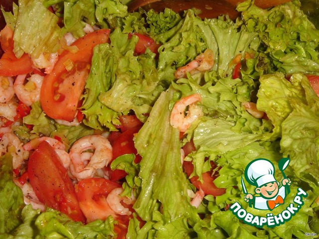 Зеленый салат порвать, смешать с помидорами и креветками. Приправить солью и черным перцем.