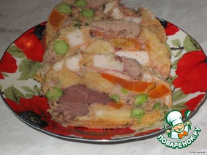 Рулет из печенки, ветчины, курицы и овощей. Делали впервые, нам понравилось.