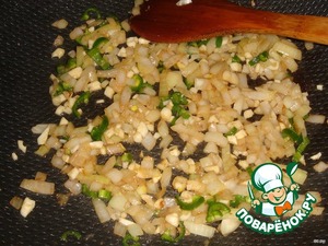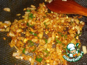 В этом же жире обжарить мелко порезанный лук, добавить измельченный чили и чеснок.