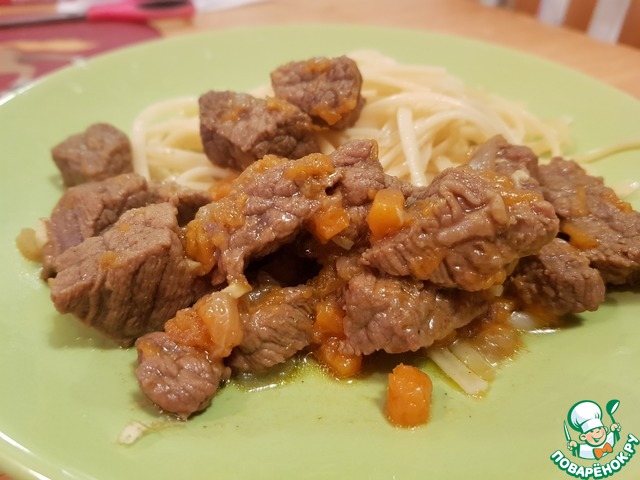 После удачного эксперимента с тыквой решила продолжить. Теперь уже с другим мясом - говядиной и с карри. Вкус очень интересный, для любителей пряных блюд. А мясо, приготовленное по такому рецепту, такое мягкое, просто тает во рту.