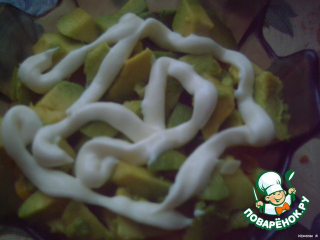 Потом кубиками режем авокадо и выкладываем на кукурузу.