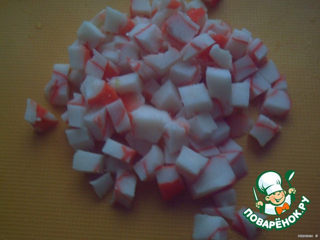 Затем выкладываем нарезанные кубиками крабовые палочки.