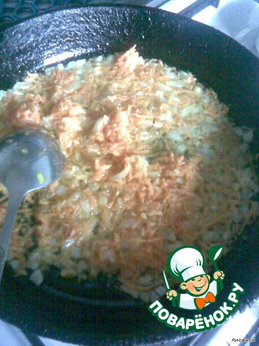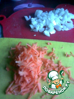 опять же измельчаем лук, трем морковку на крупной терке. И обжариваем.