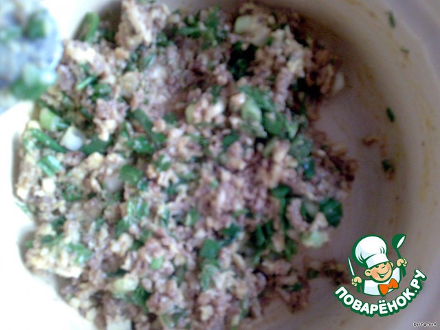 Смешать с обжаренным мясным фаршем, добавить яйцо и муку. -