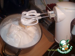 Тем временем взбиваем белки в крепкую пену, добавляем сахар и взбиваем, пока сахар не растворится