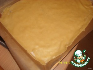 Тесто достаём из холодильника, делим на 6 частей. Раскатываем очень тонкий пласт и покрываем его частью начинки - это примерно 3 ст. л.